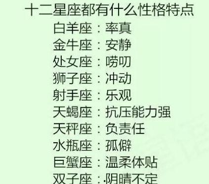 1. 白羊座:白羊座的人热情、直率,具有很强的领导力。在娱乐圈,白羊座的明星们如杨幂、赵丽颖等,都是人气爆棚的当红炸子鸡。