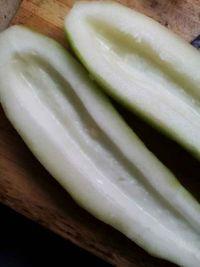 切片时,用刀背轻轻拍打毛瓜,这样更容易切。切块时,可以沿着毛瓜的纹理来切,这样切出来的块更加均匀。